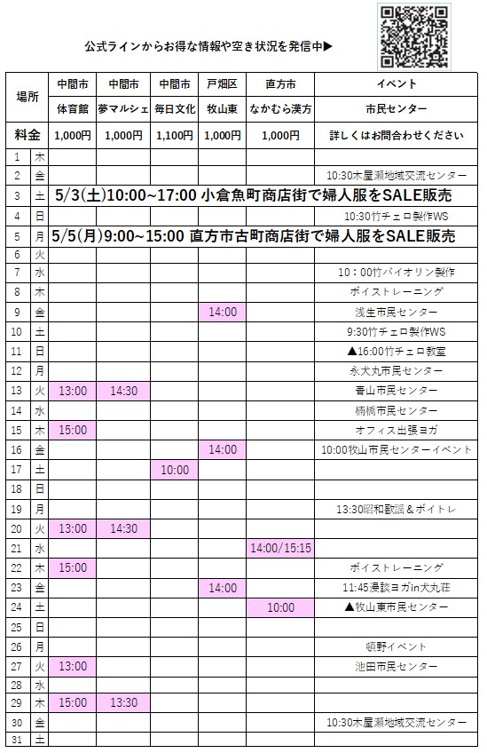 こちらのスケジュール以外にもヨガレッスンしています。お問い合わせください。